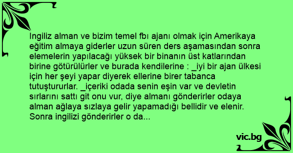Ingiliz alman ve bizim temel fbı ajanı olmak için Amerikaya eğitim almaya giderler uzun süren ders aşamasından sonra elemelerin yapılacağı yüksek bir binanın üst katlarından birine götürülürler ve burada kendilerine : _iyi bir ajan ülkesi için her şeyi yapar diyerek ellerine birer tabanca tutuştururlar. _içeriki odada senin eşin var ve devletin sırlarını sattı giт onu vur, diye almanı gönderirler odaya alman ağlaya sızlaya gelir yapamadığı bellidir ve elenir. Sonra ingilizi gönderirler o da başarılı olamaz sıra temele gelmiştir. odaya hışımla dalıp kapıyı çarpar ve ardından tabanca sesleri gelmeye başlar bir süre sessizliğin ardındanda büyük bir gürültü ile cam kırılma sesleri gelir dışarıda bekleyen heyet hemen odaya girerler ama oda da temelden başkası yoktur ve odanın camı kırılmıştır...
