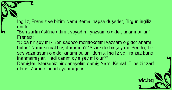 "O da bir şey mi? Ben sadece memleketimi yazsam o gider anamı bulur." Namı kemal boş durur mu? "Sizinkide bir şey mi. Ben hiç bir şey yazmasam o gider anamı bulur." demiş. Ingiliz ve Fransız buna inanmamışlar."Hadi canım öyle şey mi olur?"
