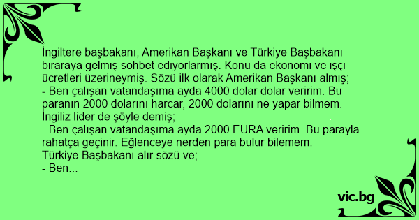 İngiltere başbakanı, Amerikan Başkanı ve Türkiye Başbakanı biraraya gelmiş sohbet ediyorlarmış. Konu da ekonomi ve işçi ücretleri üzerineymiş. Sözü ilk olarak Amerikan Başkanı almış;