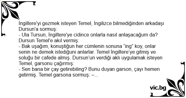 - Bak uşağım, konuştiğun her cümlenin sonuna “ing” koy, onlar senin ne demek istediğuni anlarlar. Temel İngiltere’ye gitmiş ve soluğu bir cafede almış. Dursun’un verdiği aklı uygulamak isteyen Temel, garsonu çağırmış: