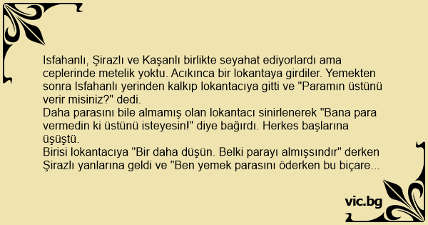 Isfahanlı, Şirazlı ve Kaşanlı birlikte seyahat ediyorlardı ama ceplerinde metelik yoktu. Acıkınca bir lokantaya girdiler. Yemekten sonra Isfahanlı yerinden kalkıp lokantacıya gitti ve "Paramın üstünü verir misiniz?" dedi.