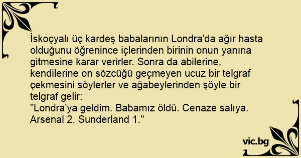 İskoçyalı üç kardeş babalarının Londra'da ağır hasta olduğunu öğrenince içlerinden birinin onun yanına gitmesine karar verirler. Sonra da abilerine, kendilerine on sözcüğü geçmeyen ucuz bir telgraf çekmesini söylerler ve ağabeylerinden şöyle bir telgraf gelir: