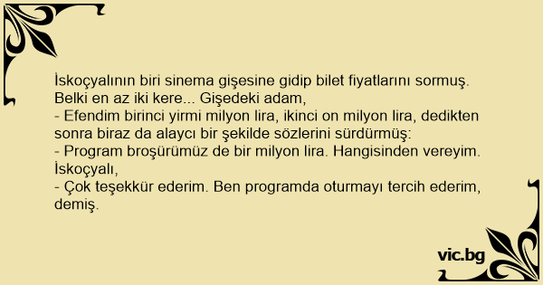 İskoçyalının biri sinema gişesine gidip bilet fiyatlarını sormuş. Belki en az iki kere... Gişedeki adam,