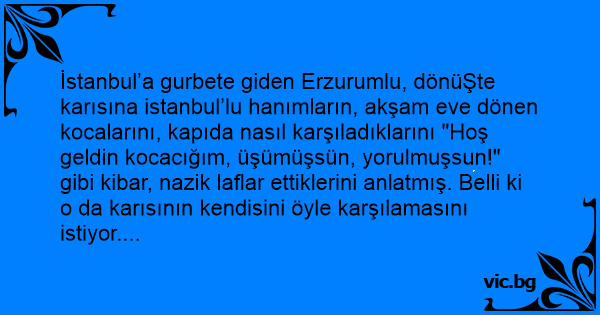 İstanbul’a gurbete giden Erzurumlu, dönüŞte karısına istanbul’lu hanımların, akşam eve dönen kocalarını, kapıda nasıl karşıladıklarını "Hoş geldin kocacığım, üşümüşsün, yorulmuşsun!" gibi kibar, nazik laflar ettiklerini anlatmış. Belli ki o da karısının kendisini öyle karşılamasını istiyor....