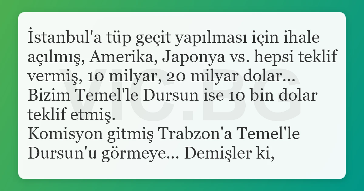 İstanbul'a tüp geçit yapılması için ihale açılmış, Amerika, Japonya vs. hepsi teklif vermiş, 10 milyar, 20 milyar dolar... Bizim Temel'le Dursun ise 10 bin dolar teklif etmiş. Komisyon gitmiş Trabzon'a Temel'le Dursun'u görmeye... Demişler ki,