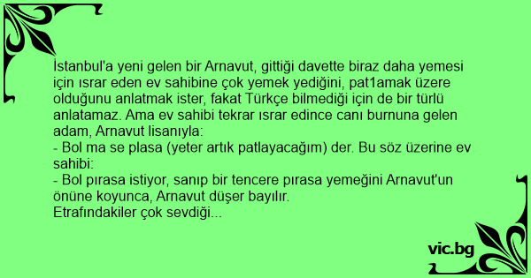 İstanbul'a yeni gelen bir Arnavut, gittiği davette biraz daha yemesi için ısrar eden ev sahibine çok yemek yediğini, pat1amak üzere olduğunu anlatmak ister, fakat Türkçe bilmediği için de bir türlü anlatamaz. Ama ev sahibi tekrar ısrar edince canı burnuna gelen adam, Arnavut lisanıyla: