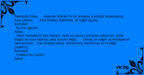 - Hayır komutanım ben Sarıyer` liyim ve sarıyer orduevini istiyorum. İçime doğdu bu kura İstanbul ama Sarıyer değil.. Demiş ve kağıdı açmayaparsın bilemiyecem... Dan torbaya atmış. Karıştırmış, karıştırmış ve bi kağıt çıkartmış.