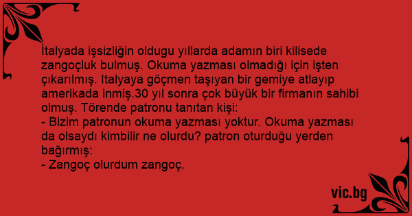 İtalyada işsizliğin oldugu yıllarda adamın biri kilisede zangoçluk bulmuş. Okuma yazması olmadığı için işten çıkarılmış. Italyaya göçmen taşıyan bir gemiye atlayıp amerikada inmiş.30 yıl sonra çok büyük bir firmanın sahibi olmuş. Törende patronu tanıtan kişi: