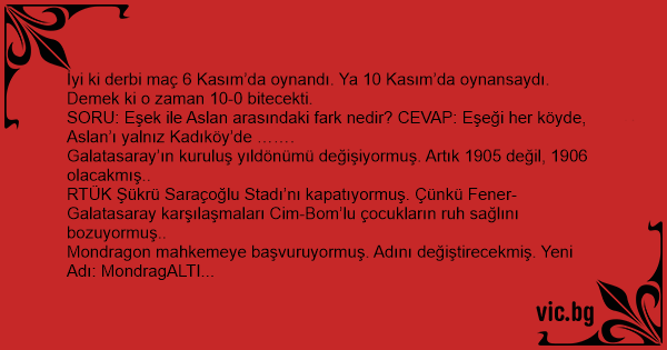İyi ki derbi maç 6 Kasım’da oynandı. Ya 10 Kasım’da oynansaydı. Demek ki o zaman 10-0 bitecekti.