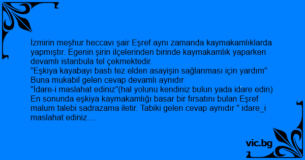 İzmirin meşhur heccavı şair Eşref aynı zamanda kaymakamlıklarda yapmıştır. Egenin şirin ilçelerinden birinde kaymakamlık yaparken devamlı istanbula tel çekmektedir.