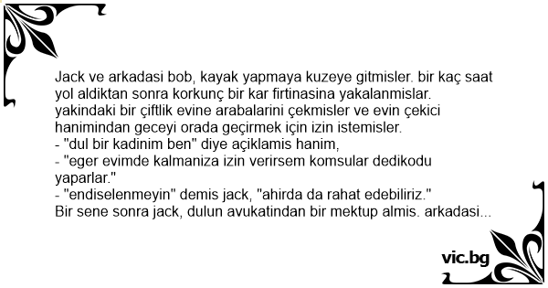 Jack ve arkadasi bob, kayak yapmaya kuzeye gitmisler. bir kaç saat yol aldiktan sonra korkunç bir kar firtinasina yakalanmislar. yakindaki bir çiftlik evine arabalarini çekmisler ve evin çekici hanimindan geceyi orada geçirmek için izin istemisler.