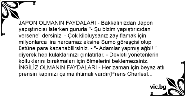 JAPON OLMANIN FAYDALARI - Bakkalınızdan Japon yapıştırıcısı isterken gururla "- Şu bizim yapıştırıcıdan versene" dersiniz. - Çok kiloluysanız zayıflamak için milyonlarca lira harcamaz aksine Sumo göreşçisi olup üstüne para kazanabilirsiniz. - "- Adamlar yapmış ağbi! " diyerek hep kulaklarınızı çınlatırlar. - Devleti yönetenlerin koltuklarını bırakmaları için ölmelerini beklemezsiniz.