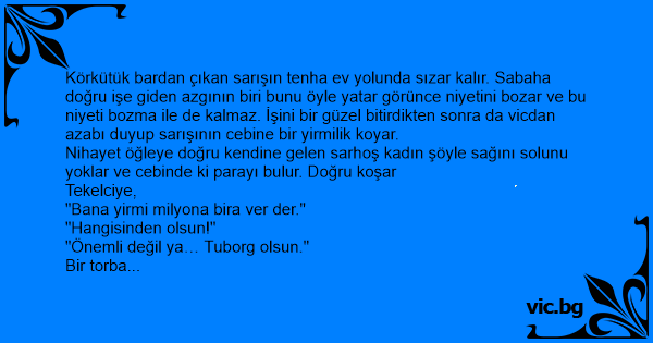 Nihayet öğleye doğru kendine gelen sarhoş kadın şöyle sağını solunu yoklar ve cebinde ki parayı bulur. Doğru koşar