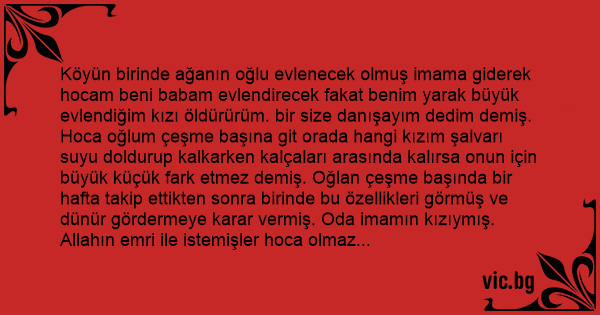 Hoca oğlum çeşme başına giт orada hangi kızım şalvarı suyu doldurup kalkarken kalçaları arasında kalırsa onun için büyük küçük fark etmez demiş. Oğlan çeşme başında bir hafta takip ettikten sonra birinde bu özellikleri görmüş ve dünür gördermeye karar vermiş. Oda imamın kızıymış.
