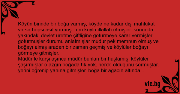 Köyün birinde bir boğa varmış, köyde ne kadar dişi mahlukat varsa hepsi asılıyormuş. tüm köylü illallah etmişler. sonunda yakındaki devlet üretme çiftliğine götürmeye karar vermişler. götürmüşler durumu anlatmışlar müdür pek memnun olmuş ve boğayı almış aradan bir zaman geçmiş ve köylüler boğayı görmeye gitmişler.