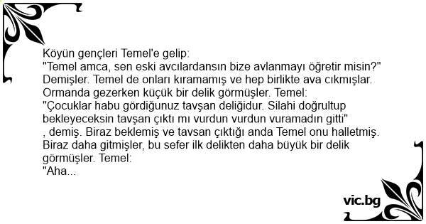 , demiş. Biraz beklemiş ve tavsan çıktığı anda Temel onu halletmiş. Biraz daha gitmişler, bu sefer ilk delikten daha büyük bir delik görmüşler. Temel: