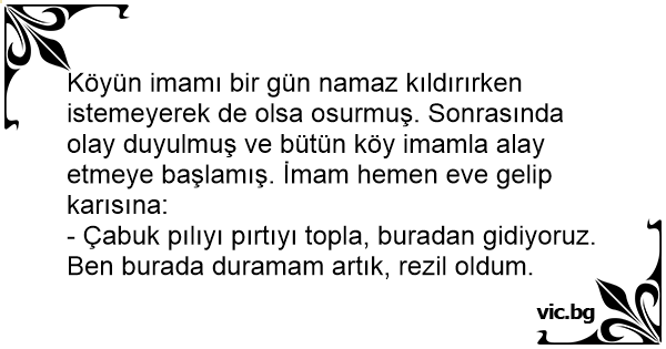 Köyün imamı bir gün namaz kıldırırken istemeyerek de olsa osurmuş. Sonrasında olay duyulmuş ve bütün köy imamla alay etmeye başlamış. İmam hemen eve gelip karısına: