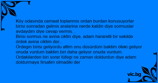 Köy odasinda cemaat toplanmis ordan burdan konusuyorlar birisi sonradan gelmis aralarina nerde kaldin diye sormuslar avdaydim diye cevap vermis...
