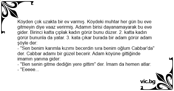 Köyden çok uzakta bir ev varmış. Köydeki muhtar her gün bu eve gitmeyin diye vaaz verirmiş. Adamın birisi dayanamayarak bu eve gider. Birinci katta çıplak kadın görür bunu düzer. 2. katta kadın görür bununla da yatar. 3. kata çıkar burada bir adam görür adam şöyle der: