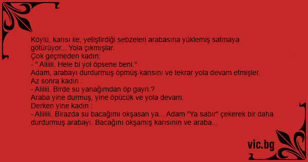 - Aliiiiii. Birazda su bacağımı okşasan ya... Adam "Ya sabır" çekerek bir daha durdurmuş arabayı. Bacağını okşamış karısının ve araba tekrar giderken, kadın :