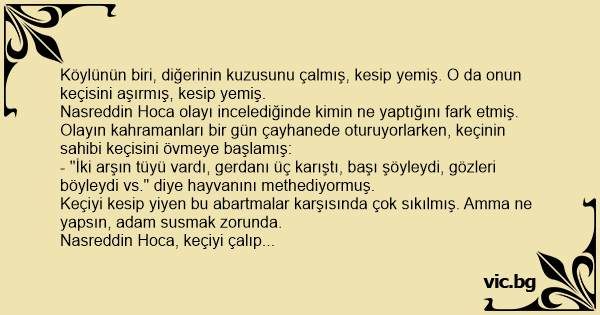 Köylünün biri, diğerinin kuzusunu çalmış, kesip yemiş. O da onun keçisini aşırmış, kesip yemiş.