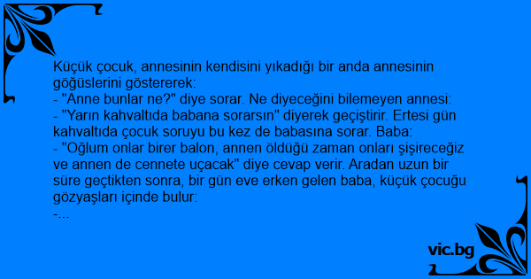 - "Oğlum onlar birer balon, annen öldüğü zaman onları şişireceğiz ve annen de cennete uçacak" diye cevap verir. Aradan uzun bir süre geçtikten sonra, bir gün eve erken gelen baba, küçük çocuğu gözyaşları içinde bulur: