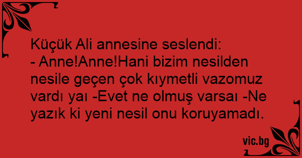 - Anne!Anne!Hani bizim nesilden nesile geçen çok kıymetli vazomuz vardı yaı -Evet ne olmuş varsaı -Ne yazık ki yeni nesil onu koruyamadı.
