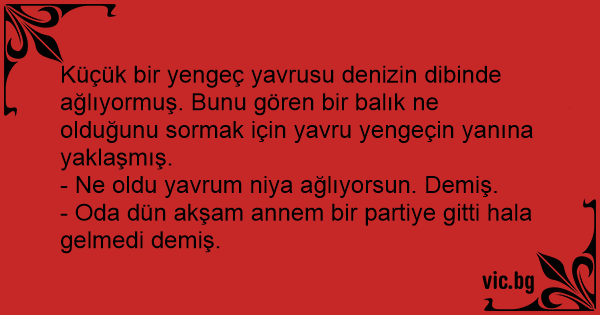 Küçük bir yengeç yavrusu denizin dibinde ağlıyormuş. Bunu gören bir balık ne olduğunu sormak için yavru yengeçin yanına yaklaşmış.