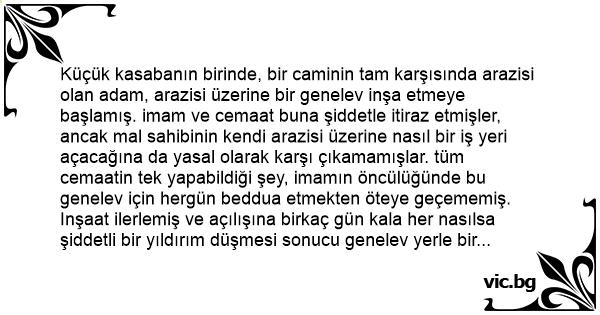 Küçük kasabanın birinde, bir caminin tam karşısında arazisi olan adam, arazisi üzerine bir genelev inşa etmeye başlamış. imam ve cemaat buna şiddetle itiraz etmişler, ancak mal sahibinin kendi arazisi üzerine nasıl bir iş yeri açacağına da yasal olarak karşı çıkamamışlar. tüm cemaatin tek yapabildiği şey, imamın öncülüğünde bu genelev için hergün beddua etmekten öteye geçememiş.
