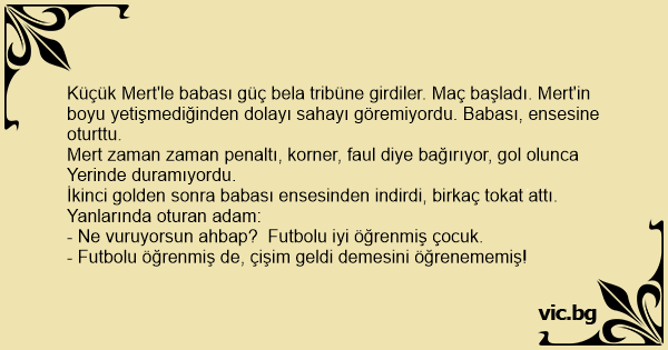 Küçük Mert'le babası güç bela tribüne girdiler. Maç başladı. Mert'in boyu yetişmediğinden dolayı sahayı göremiyordu. Babası, ensesine oturttu.