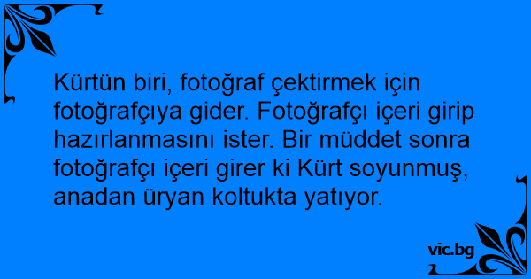 Kürtün biri, fotoğraf çektirmek için fotoğrafçıya gider. Fotoğrafçı içeri girip hazırlanmasını ister. Bir müddet sonra fotoğrafçı içeri girer ki Kürt soyunmuş, anadan üryan koltukta yatıyor.