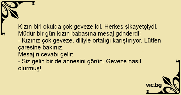 Kızın biri okulda çok geveze idi. Herkes şikayetçiydi. Müdür bir gün kızın babasına mesaj gönderdi: