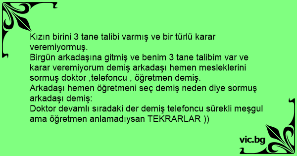 Birgün arkadaşına gitmiş ve benim 3 tane talibim var ve karar veremiyorum demiş arkadaşı hemen mesleklerini sormuş doktor ,telefoncu , öğretmen demiş.