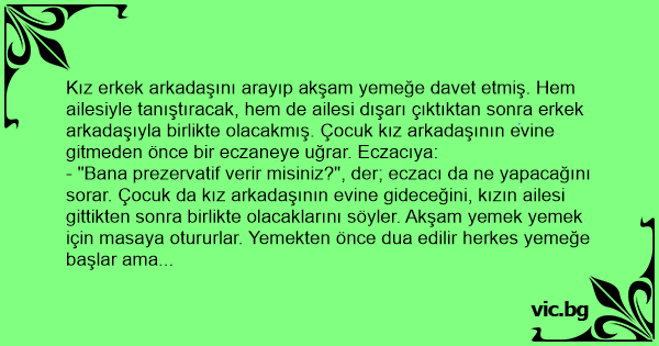 Kız erkek arkadaşını arayıp akşam yemeğe davet etmiş. Hem ailesiyle tanıştıracak, hem de ailesi dışarı çıktıktan sonra erkek arkadaşıyla birlikte olacakmış. Çocuk kız arkadaşının evine gitmeden önce bir eczaneye uğrar. Eczacıya:
