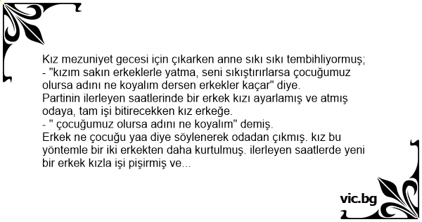- "kızım sakın erkeklerle yatma, seni sıkıştırırlarsa çocuğumuz olursa adını ne koyalım dersen erkekler kaçar" diye.