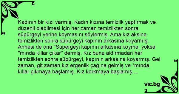 Kadının bir kızı varmış. Kadın kızına temizlik yaptırmak ve düzenli olabilmesi için her zaman temizlikten sonra süpürgeyi yerine koymasını söylermiş. Ama kız aksine temizlikten sonra süpürgeyi kapının arkasına koyarmış. Annesi de ona "Süpergeyi kapının arkasına koyma, yoksa *mında kıllar çıkar" dermiş. Kız buna aldırmadan her temizlikten sonra süpürgeyi, kapının arkasına koyarmış. Gel zaman, giт zaman kız ergenlik çağına gelmiş ve *mında kıllar çıkmaya başlamış. Kız korkmaya başlamış. "Amannn, ben süpürgeyi kapının arkasına koydum. Onun için *mımda kıllar çıkmaya başladı" demiş. Annesine "Anne, benim *mımda kıllar çıkıyor" diye söylemiş. Annesi, kızına "Kızım, ergenlik çağına giren herkezde olur" demiş ama kız buna inanmamış ve "Hayırrrrr, ben süpürgeyi kapının arkasına koydum, onun için" demiş. Annesi anlatmaya çalışsa da kızı bir türlü inandıramamış. En sonunda bir psikoloğa götürmeye karar vermiş. Psikolk da aynı şeyleri söylemiş ama kız hala inanmamakta direnmiş ve "Hayır Doktor Bey, ben süpürgeyi kapının arkasına koydum, onun için oldu" demiş. Doktor da artık defalarca anlatmaktan bıkmış. Kız bir türlü inanmıyor. Doktor "Bak kızım, bende de aynısı var" demiş. Kız "İnanmam Doktor Bey, beni kandırmak için öyle söylüyorsunuz" demiş. Sonunda doktor artık dayanamamış, açmış penisini göstermiş ve "Bak, bende de var o kıllardan" demiş. Kız şaşırmış: