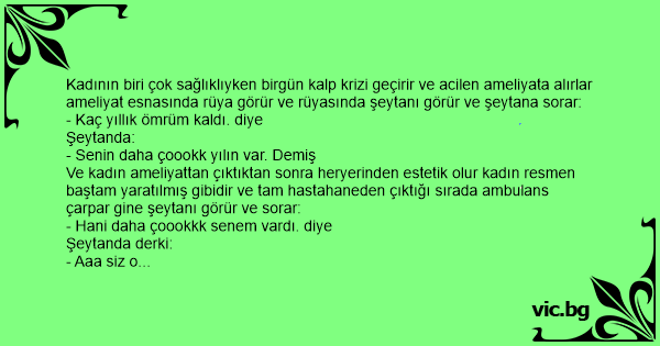 Ve kadın ameliyattan çıktıktan sonra heryerinden estetik olur kadın resmen baştam yaratılmış gibidir ve tam hastahaneden çıktığı sırada ambulans çarpar gine şeytanı görür ve sorar: