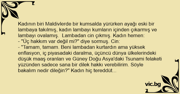 - "Tamam, tamam. Beni lambadan kurtardın ama yüksek enflasyon, iç piyasadaki daralma, üçüncü dünya ülkelerindeki düşük maaş oranları ve Güney Doğu Asya'daki Tsunami felaketi yüzünden sadece sana bir dilek hakkı verebilirim. Söyle bakalım nedir dileğin?" Kadın hiç tereddüt etmeden, cebinden bir harita çıkararak: