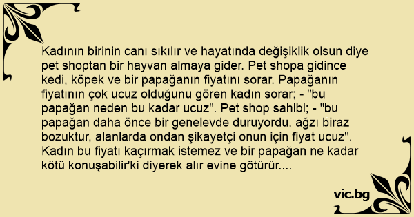 Kadının birinin canı sıkılır ve hayatında değişiklik olsun diye pet shoptan bir hayvan almaya gider. Pet shopa gidince kedi, köpek ve bir papağanın fiyatını sorar. Papağanın fiyatının çok ucuz olduğunu gören kadın sorar; - "bu papağan neden bu kadar ucuz". Pet shop sahibi; - "bu papağan daha önce bir genelevde duruyordu, ağzı biraz bozuktur, alanlarda ondan şikayetçi onun için fiyat ucuz". Kadın bu fiyatı kaçırmak istemez ve bir papağan ne kadar kötü konuşabilir'ki diyerek alır evine götürür. Eve gelince kadın papağanın örtüsünü kaldırır. Yeni ortamı gören papağan; - "ooo yeni mekan, yeni patron" der. Kadın bunlara gülüp geçer. Daha sonra evin iki kızı okuldan gelir. Papağan bunları görerek; - "ooo yeni mekan, yeni patron, yeni kızlar" der. Tabii kızlar saşkın. Anneleri olayı anlatınca kızlar'da gülerler. Bu sırada evin babası gelir. Papagan yine açar ağzını; - "yeni mekan, yeni patron, yeni kızlar" sonra evin babasına bakarak; - "oooo, Mehmet abi hoş geldin yaaa"