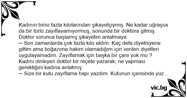 Kadının birisi fazla kilolarından şikayetçiymiş. Ne kadar uğraşsa da bir türlü zayıflayamıyormuş, sonunda bir doktora gitmiş. Doktor sorunca başlamış şikayetini anlatmaya: