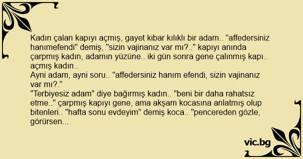 Kadın çalan kapıyı açmış, gayet kibar kılıklı bir adam.. "affedersiniz hanımefendi" demiş, "sizin vajinanız var mı?.." kapıyı anında çarpmış kadın, adamın yüzüne.. iki gün sonra gene çalınmış kapı.. açmış kadın..
