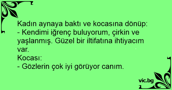 Kona står naken og ser seg selv i speilet. Hun sier til mannen: "Jeg er gammel, fet og stygg. Kan du ikke gi meg et kompliment?" Mannen: "Jo synet ditt er perfekt..."