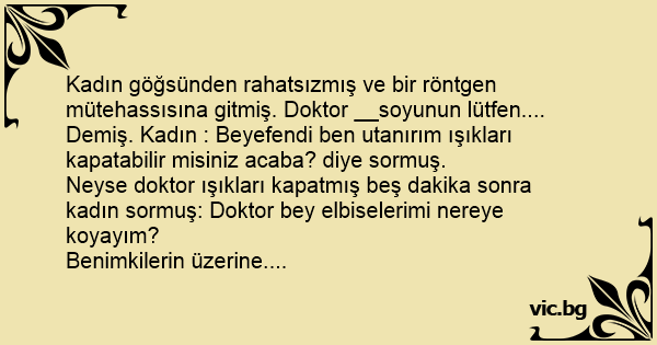 Kadın göğsünden rahatsızmış ve bir röntgen mütehassısına gitmiş. Doktor __soyunun lütfen.... Demiş. Kadın : Beyefendi ben utanırım ışıkları kapatabilir misiniz acaba? diye sormuş.