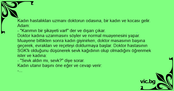 Doktor kadına uzanmasını söyler ve normal muayenesini yapar. Muayene bittikten sonra kadın giyinirken, doktor masasının başına geçerek, evrakları ve reçeteyi doldurmaya başlar. Doktor hastasının SGK'lı olduğunu düşünerek sevk kağıdının olup olmadığını öğrenmek ister ve kadına: