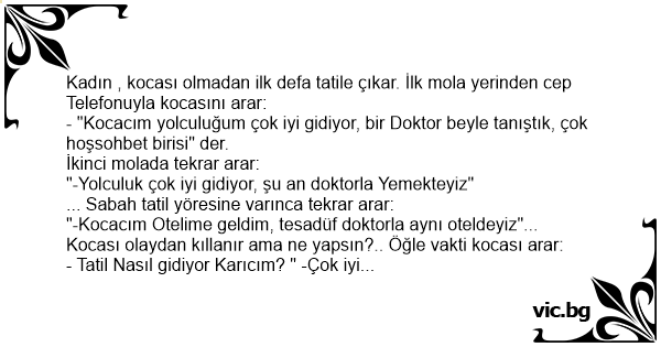 Kadın , kocası olmadan ilk defa tatile çıkar. İlk mola yerinden cep Telefonuyla kocasını arar: