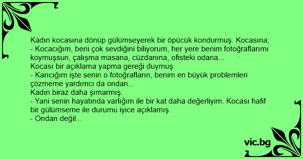 - Ondan değil karıcığım, ne zaman çözülmesi çok zor bir problemle karşılaşsam, senin fotoğraflarına bakıp "Bundan büyük problem ne olabilir ki?" deyip problemi şak diye çözüyorum.