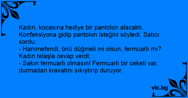 Kadın, kocasına hediye bir pantolon alacaktı. Konfeksiyona gidip pantolon isteğini söyledi. Satıcı sordu: