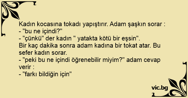 Kadın kocasına tokadı yapıştırır. Adam şaşkın sorar :