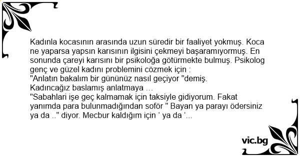 Kadınla kocasının arasında uzun süredir bir faaliyet yokmuş. Koca ne yaparsa yapsın karısının ilgisini çekmeyi başaramıyormuş. En sonunda çareyi karısını bir psikoloğa götürmekte bulmuş. Psikolog genç ve güzel kadını problemini cözmek için :