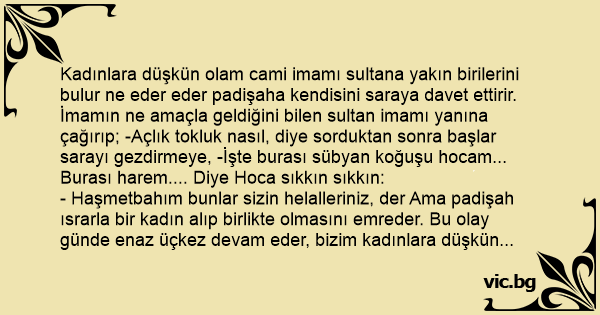 Kadınlara düşkün olam cami imamı sultana yakın birilerini bulur ne eder eder padişaha kendisini saraya davet ettirir. İmamın ne amaçla geldiğini bilen sultan imamı yanına çağırıp; -Açlık tokluk nasıl, diye sorduktan sonra başlar sarayı gezdirmeye, -İşte burası sübyan koğuşu hocam... Burası harem.... Diye Hoca sıkkın sıkkın: